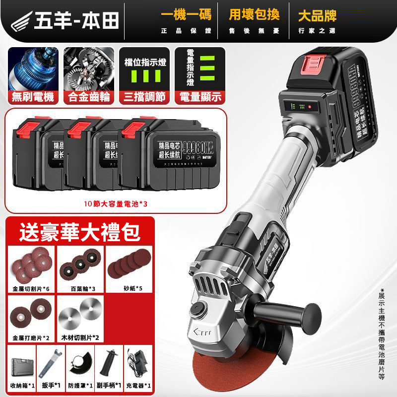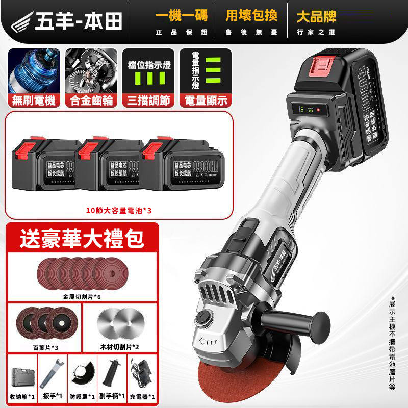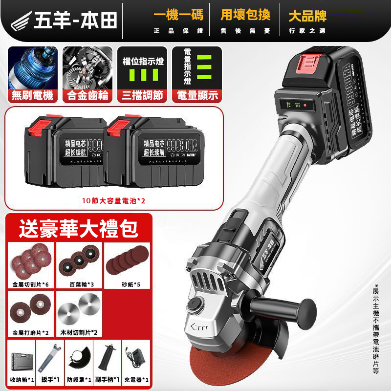15分鐘前【日本-HONDA】升級帶電顯进口無刷鋰電角磨機 打磨 拋光 切割 一機多用 純銅電機 高效散熱 配置防護護罩 保護你的安全作業 保固三年 損壞包退換 限量出清 - 69800豪華電顯款【1電池】+紙盒款