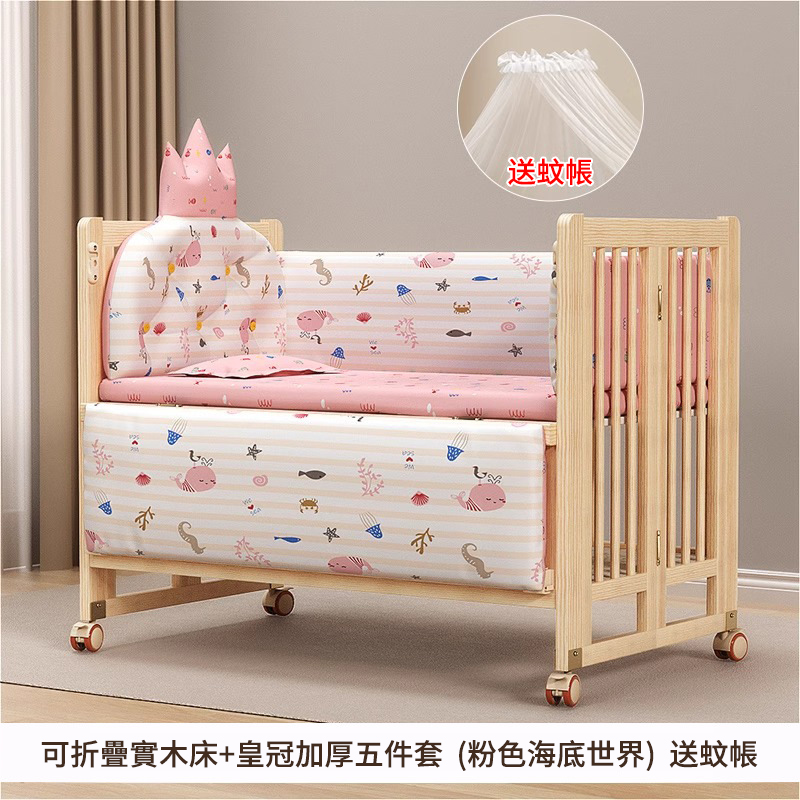 15分鐘前陪伴寶寶成長,永不閒置【嬰兒床-->遊戲床-->書桌】日本超火の可折疊嬰兒床,實木無漆更安心,可拼接大床+滑輪移動,多功能設計陪寶寶成長! - 【118*68*85cm】折疊大床+五件套+蚊帳